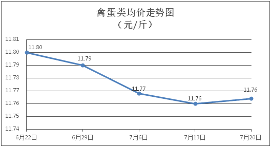 禽蛋類商品價(jià)格弱勢(shì)盤整。所監(jiān)測的5種禽蛋類商品價(jià)格波動(dòng)情況為1漲3跌1平,綜合零售均價(jià)為每斤11.76元,環(huán)比上漲0.03%。其中:白條雞、白條鴨零售均價(jià)分別為每斤20.66元、15.39元,環(huán)比分別上漲0.39%、下降0.19%;雞蛋、鴨蛋零售均價(jià)分別為每斤6.52元、7.11元,環(huán)比分別下降0.15%、持平。