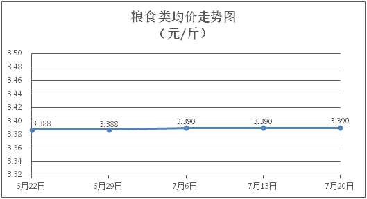 糧食類商品價(jià)格保持穩(wěn)定。所監(jiān)測的4種糧食類商品價(jià)格均持平,綜合零售均價(jià)為每斤3.390元。其中:珍珠米、面粉零售均價(jià)分別為每斤3.10元、3.40元,環(huán)比均持平。
