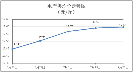 水產(chǎn)類商品價(jià)格微幅波動(dòng)。所監(jiān)測的9種水產(chǎn)商品價(jià)格波動(dòng)情況為3漲6跌,綜合均價(jià)為每斤17.60元,環(huán)比上漲0.04%。其中:草魚、鯽魚、羅非魚、基圍蝦零售均價(jià)分別為每斤11.28元、14.26元、9.07元、30.85元,環(huán)比分別上漲0.89%、下降0.35%、下降0.11%、下降0.03%。