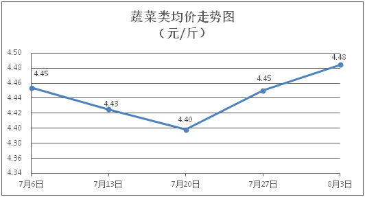 蔬菜類(lèi)商品價(jià)格以漲為主。所監(jiān)測(cè)的32 種蔬菜商品價(jià)格波動(dòng)情況為20漲9跌3平,綜合零售均價(jià)為每斤4.48元,環(huán)比上漲0.77%。其中:漲幅居前的品種包括絲瓜、韭菜、上海青,零售均價(jià)分別為每斤4.83元、4.79元、3.81元,環(huán)比分別上漲5.46%、4.13%、3.53%;跌幅靠前的品種包括生菜、紅蘿卜、菠菜,零售均價(jià)分別為每斤3.92元、2.95元、6.00元,環(huán)比分別下降1.75%、1.67%、1.48%。