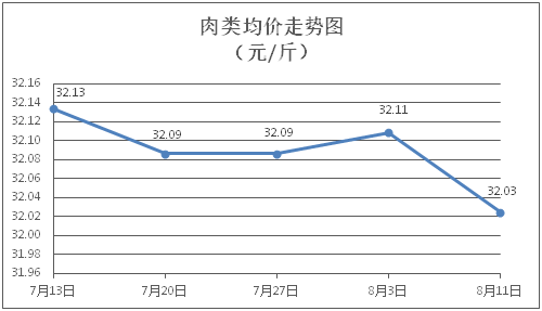 肉類商品價格微幅盤整。所監(jiān)測的8種肉類商品價格波動情況為2漲5跌1平,綜合零售均價為每斤32.03元,環(huán)比下降0.26%。其中:排骨、精瘦肉、牛肉、帶骨羊肉零售均價分別為每斤30.39元、18.92元、46.28元、42.15元,環(huán)比分別上漲0.56%、持平、上下降0.56%、上漲0.09%。