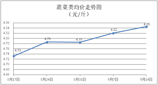 蔬菜類商品價格漲多跌少。所監(jiān)測的32 種蔬菜商品價格波動情況為19漲10跌3平,綜合零售均價為每斤4.85元,環(huán)比上漲0.53%。其中:漲幅居前的品種包括西洋菜、水東芥菜、萵筍,零售均價分別為每斤5.11元、4.72元、4.17元,環(huán)比分別上漲5.14%、3.28%、2.71%;跌幅靠前的品種包括絲瓜、白莧菜、青豆角,零售均價分別為每斤5.35元、4.38元、5.34元,環(huán)比分別下降3.43%、3.10%、2.38%。