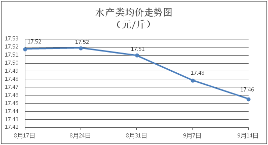 水產(chǎn)類商品價格總體略降。所監(jiān)測的9種水產(chǎn)商品價格波動情況為2漲5跌2平,綜合均價為每斤17.46元,環(huán)比下降0.13%。其中:草魚、鯽魚、羅非魚、基圍蝦零售均價分別為每斤11.36元、14.32元、8.93元、29.07元,環(huán)比分別下降0.35%、持平、上漲0.11%、下降0.89%。