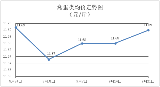禽蛋類商品價(jià)格窄幅盤整。所監(jiān)測的5種禽蛋類商品價(jià)格波動(dòng)情況為2漲1跌2平,綜合零售均價(jià)為每斤11.69元,環(huán)比上漲0.09%。其中:白條雞、白條鴨零售均價(jià)分別為每斤20.80元、15.14元,環(huán)比分別下降0.05%、持平;雞蛋、鴨蛋零售均價(jià)分別為每斤6.38元、7.09元,環(huán)比分別上漲0.47%、上漲0.42%。
