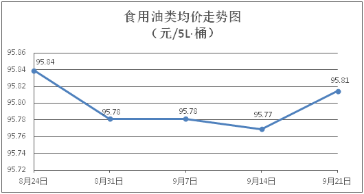 食用油類商品價(jià)格微幅上漲。所監(jiān)測的9種食用油(5L裝)商品價(jià)格波動(dòng)情況為6漲1跌2平,綜合零售均價(jià)為每桶95.81元,環(huán)比上漲0.05%。其中:魯花花生油、菜籽油零售均價(jià)分別為每桶156.49元、73.53元,環(huán)比分別上漲0.04%、上漲0.01%。