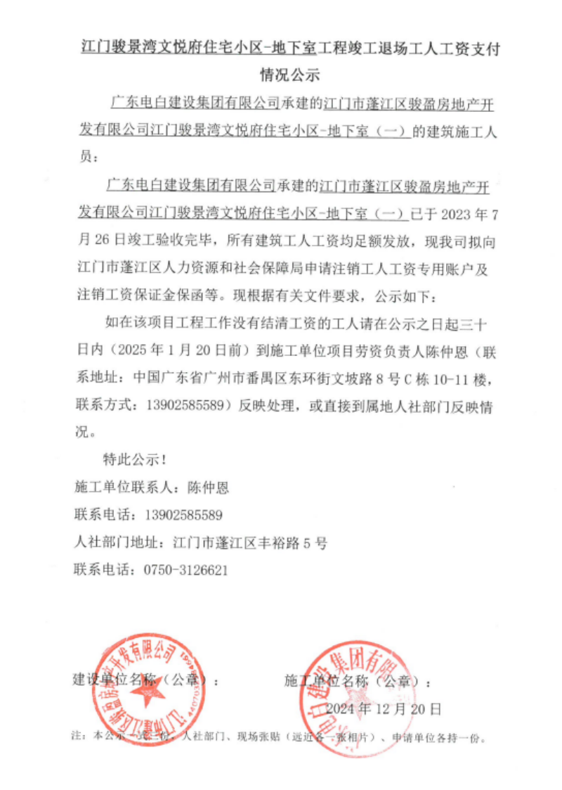 現(xiàn)將江門駿景灣文悅府住宅小區(qū)-地下室工程項(xiàng)目《工程竣工退場工人工資支付情況公示》掛網(wǎng)公示如下,如發(fā)現(xiàn)該項(xiàng)目存在欠薪等相關(guān)情況的,請(qǐng)?jiān)?0日內(nèi),請(qǐng)攜帶相關(guān)佐證材料,到施工單位項(xiàng)目或者人社部門反映情況。
