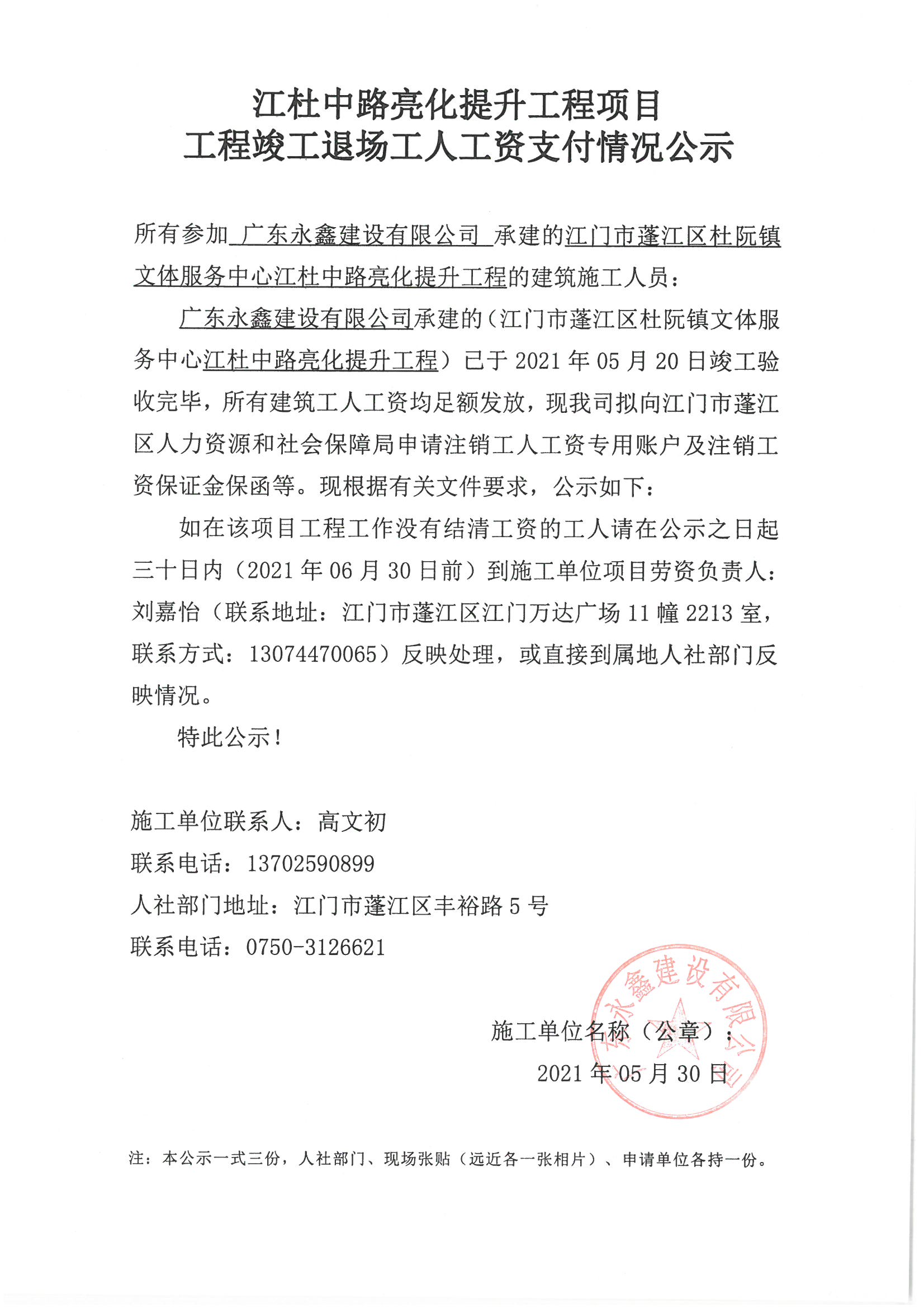現將江杜中路亮化提升工程項目《工程竣工退場工人工資支付情況公示》掛網公示如下,如發(fā)現該項目存在欠薪等相關情況的,請在30日內,請攜帶相關佐證材料,到施工單位項目或者人社部門反映情況。