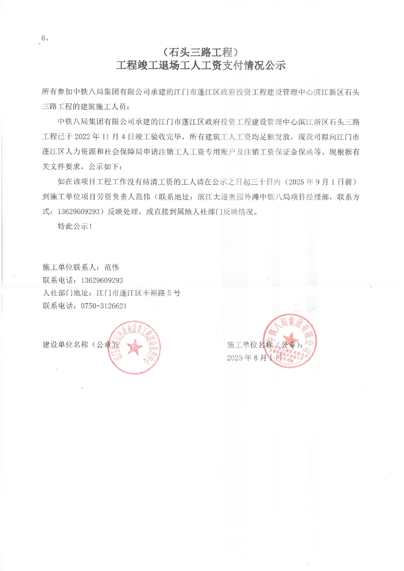 現(xiàn)將石頭三路工程《工程竣工退場工人工資支付情況公示》掛網(wǎng)公示如下,如發(fā)現(xiàn)該項(xiàng)目存在欠薪等相關(guān)情況的,請在30日內(nèi),請攜帶相關(guān)佐證材料,到施工單位項(xiàng)目或者人社部門反映情況。
