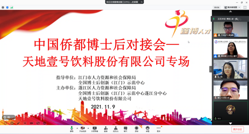11月9日,在市人社局和市博創(chuàng)中心的指導(dǎo)下,蓬江人社局聯(lián)合博創(chuàng)蓬江分中心在線上成功舉辦中國(guó)僑都博士對(duì)接交流會(huì)——天地壹號(hào)飲料股份有限公司專(zhuān)場(chǎng)。