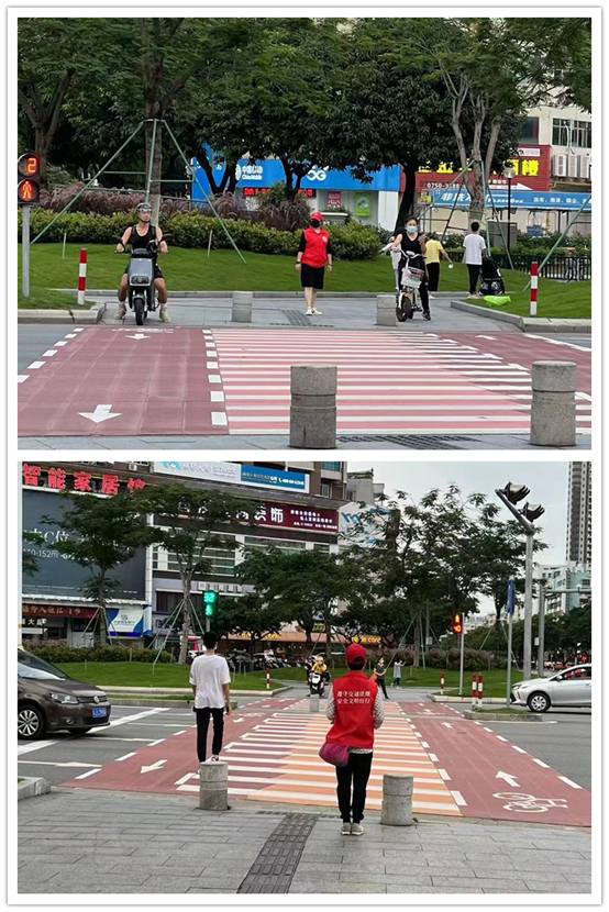 近期天氣狀況不穩(wěn)定,但不管風吹雨打還是日曬雨淋,區(qū)人社局的黨員干部職工志愿者們依舊堅守在道路一線。在早中晚交通高峰時段,他們統(tǒng)一身穿紅馬甲,手拿“文明出行”小紅旗,提醒行人按交通信號燈過馬路,對行人、電動車亂穿馬路、闖紅燈等不文明行為予以耐心的禮貌勸導,引導過往行人遵守交通法規(guī),文明行路、文明行車,用行動告訴市民文明參與交通的重要性。