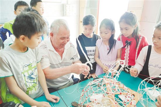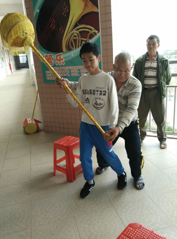 紗龍龍會師傅李振圖向?qū)W生傳授紗龍制作和舞龍技藝