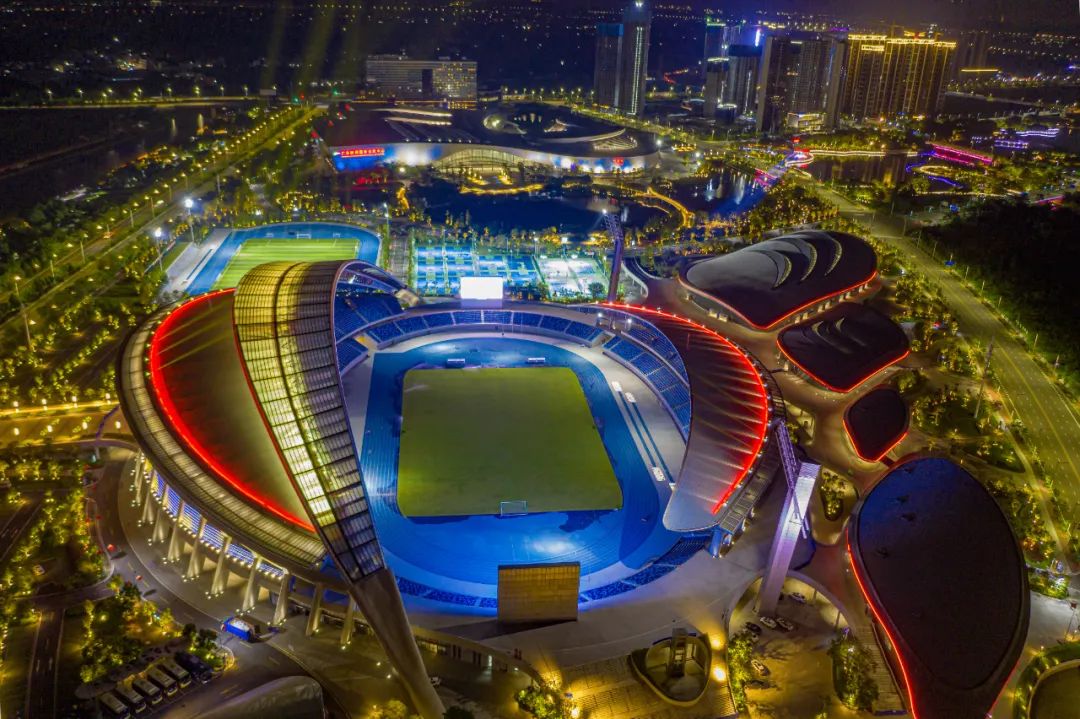 夜幕下的珠西國際會展中心和江門體育中心分外迷人。江門日報記者/周華東 攝