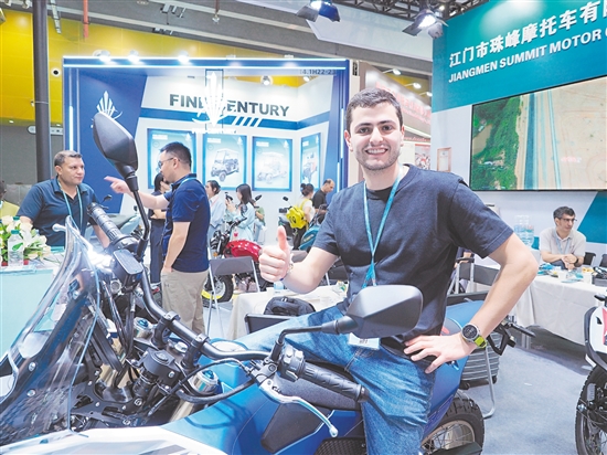 在江門市珠峰摩托車有限公司展位,外國客商前來了解摩托車新品情況,并為產品點贊。張澤彬 攝