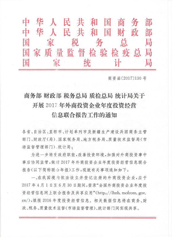 附件:《商務(wù)部 財(cái)政部 稅務(wù)總局 質(zhì)檢總局 統(tǒng)計(jì)局關(guān)于開(kāi)展2017年外商投資企業(yè)年度投資經(jīng)營(yíng)信息聯(lián)合年報(bào)工作的通知》(商資函〔2017〕130號(hào))