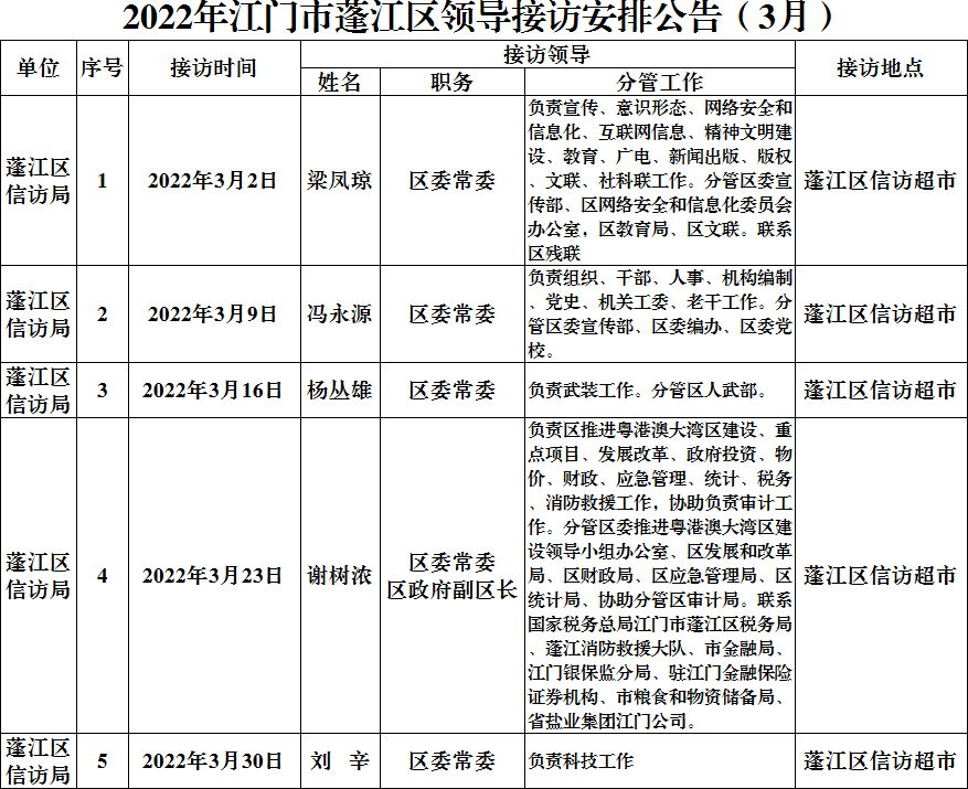2022年江門市蓬江區(qū)領(lǐng)導(dǎo)接訪安排公告(3月)