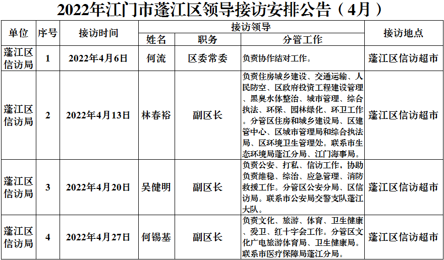2022年江門市蓬江區(qū)領(lǐng)導(dǎo)接訪安排公告(4月)