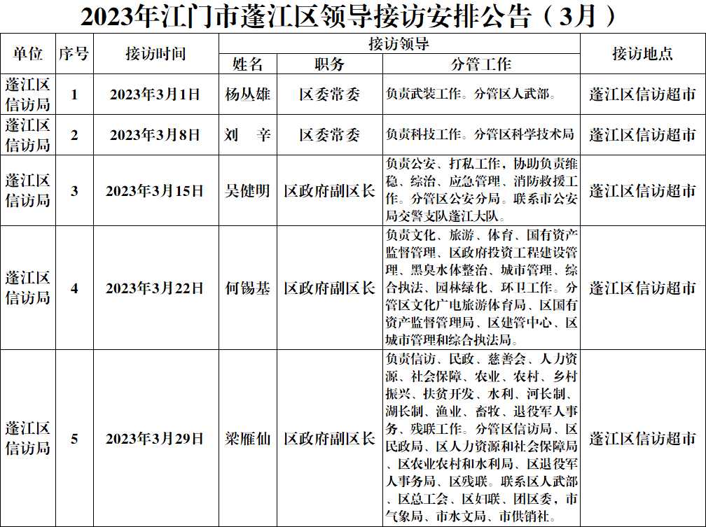2023年江門市蓬江區(qū)領(lǐng)導(dǎo)接訪安排公告(3月)