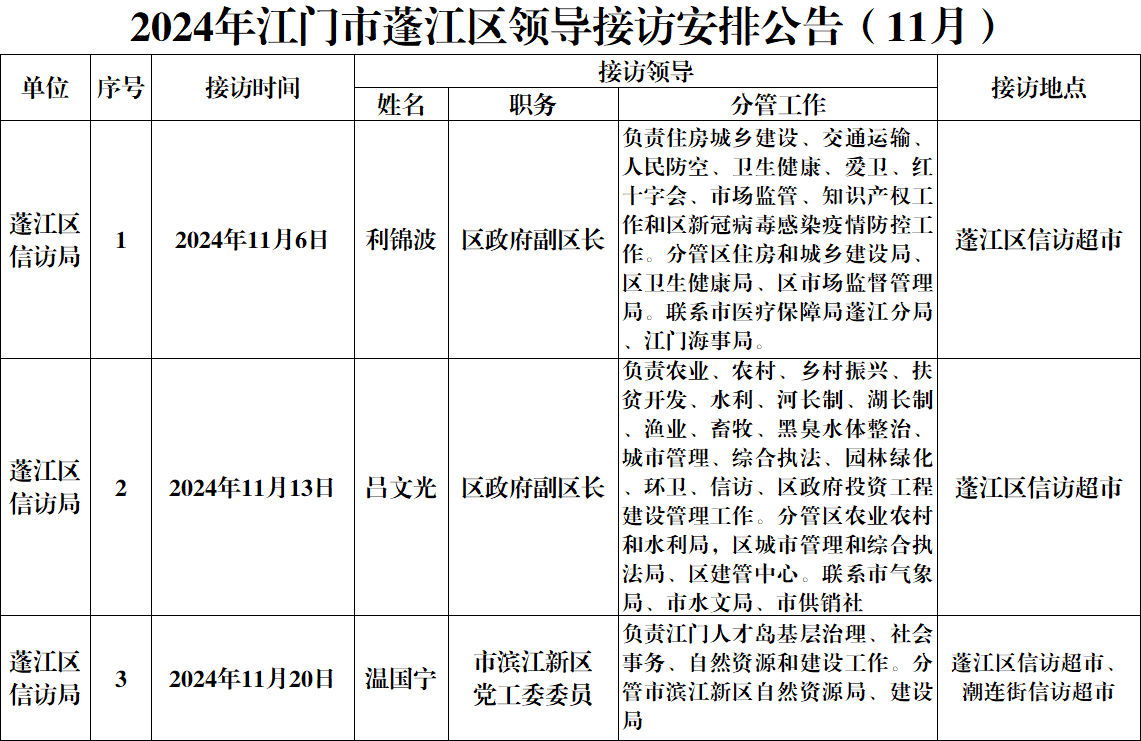 2024年江門市蓬江區(qū)領(lǐng)導(dǎo)接訪安排公告(11月)