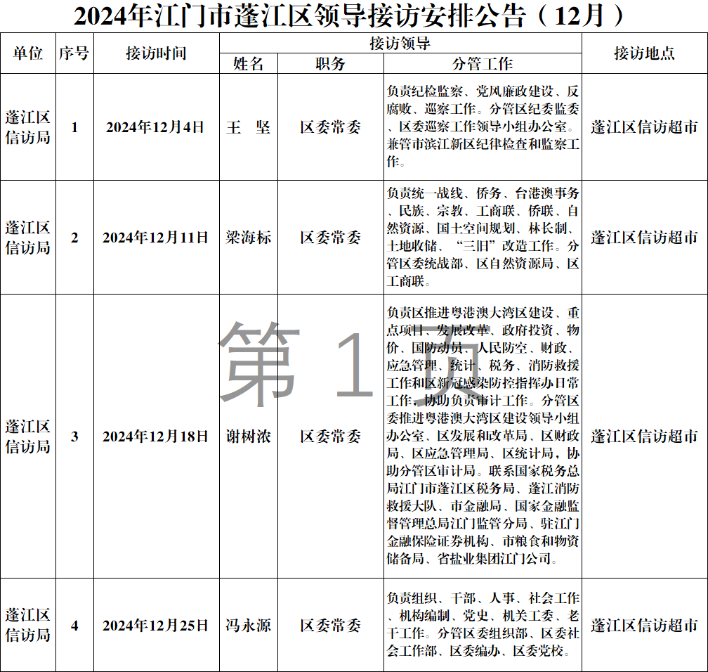 2024年江門市蓬江區(qū)領(lǐng)導(dǎo)接訪安排公告(12月)