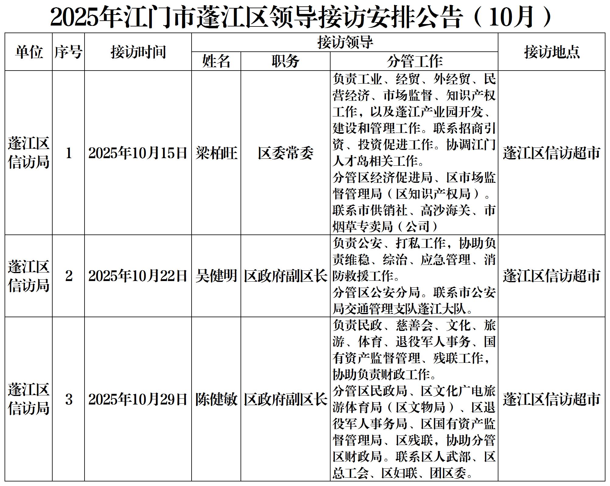 2025年江門市蓬江區(qū)領(lǐng)導(dǎo)接訪安排公告(10月)