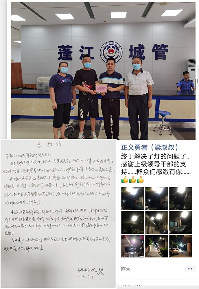 “終于解決路燈問題了,感謝上級(jí)領(lǐng)導(dǎo)干部的支持……群眾感謝有你!”近日,蓬江區(qū)城市管理和綜合執(zhí)法局在杏苑新村安裝了路燈,為附近群眾解決了夜間出行難問題。市民梁先生感慨政府的民生服務(wù)非常實(shí)在,切實(shí)解決了居民的燃眉之急,還專門送來致謝信。