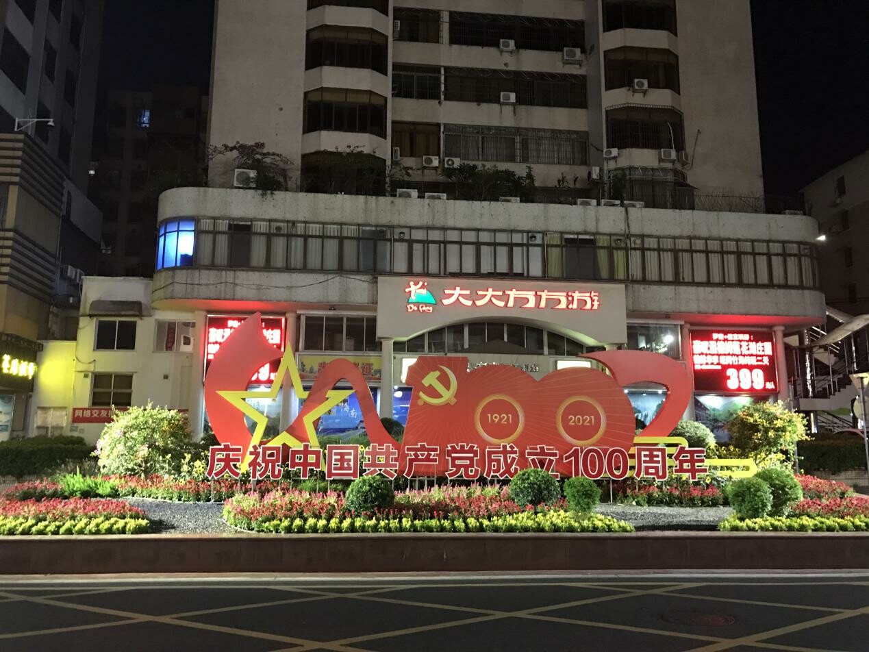 萬達(dá)廣場以“勇毅前行 續(xù)寫紅色篇章”為主題的組景造型,主要由紅旗和帶有星星圖案的波浪線組成。寓意100年來,中國共產(chǎn)黨帶領(lǐng)全國各族人民前仆后繼、頑強(qiáng)奮斗,不斷取得革命、建設(shè)、改革的重大勝利,期間嘗盡了艱難困苦,卻初心不改,矢志奮斗。在往后繼續(xù)帶領(lǐng)人民勇毅前行,續(xù)寫紅色篇章。