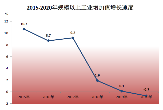 全年規(guī)模以上工業(yè)增加值比上年下降0.7%。分注冊類型看,國有及國有控股企業(yè)下降4.2%,外商及港澳臺投資企業(yè)增長0.7%,股份制企業(yè)下降1.1%,集體企業(yè)下降58.8%;分輕重工業(yè)看,輕工業(yè)下降5.5%,重工業(yè)增長2.4%;分企業(yè)規(guī)模看,大型企業(yè)下降0.5%,中型企業(yè)增長4.1%,小型企業(yè)下降3.4%,微型企業(yè)下降25.2%。