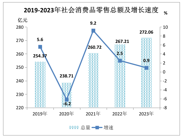 全年社會(huì)消費(fèi)品零售總額272.06億元,比上年增長(zhǎng)0.9%。其中,限上批發(fā)和零售業(yè)零售額139.33億元,下降5.1%;限上住宿和餐飲業(yè)零售額14.34億元,增長(zhǎng)18.3%。