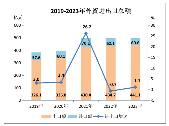 全年外貿(mào)進(jìn)出口總額501.7億元,比上年增長(zhǎng)1.1%。其中,進(jìn)口60.6億元,下降2.5%;出口總額441.1億元,增長(zhǎng)1.6%。實(shí)際利用外資1.9億元,下降41.8%。