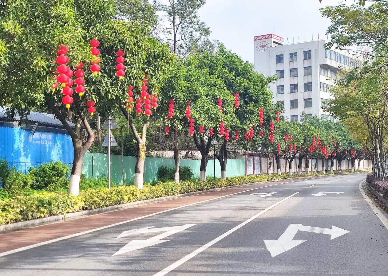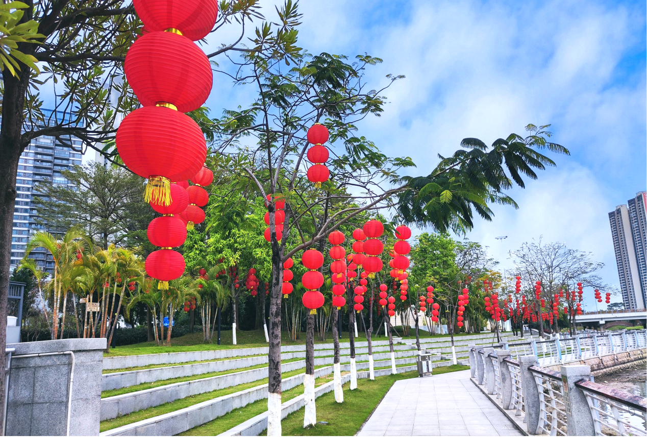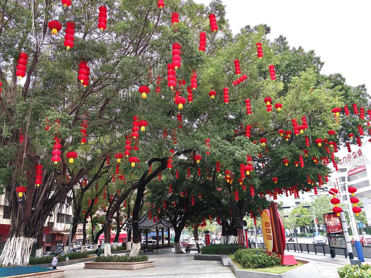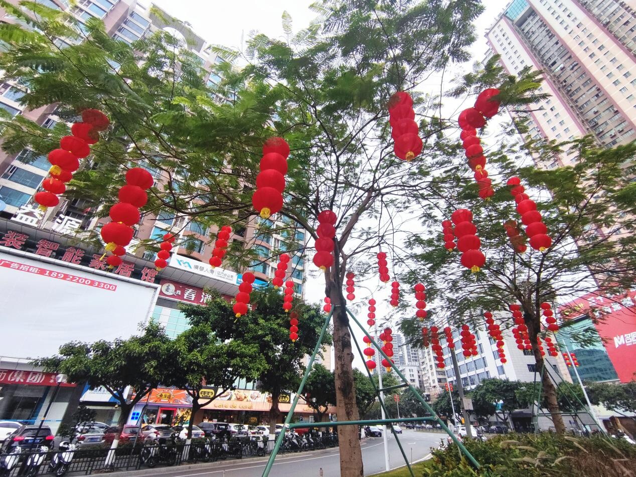 一個個紅燈籠悄然地爬上樹梢,為蓬江街頭增添春節(jié)氣息