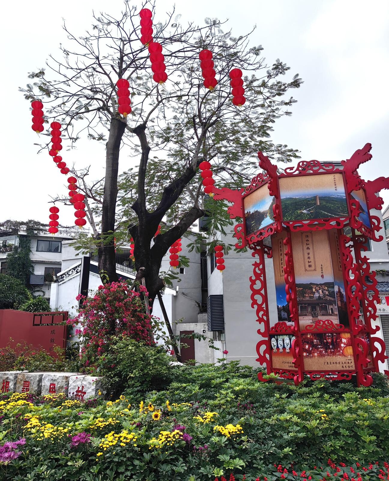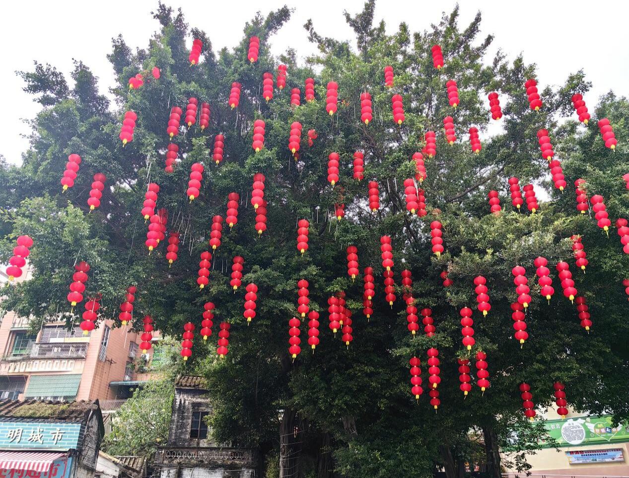象征著團圓與幸福的紅燈籠點綴在樹上,成了一道靚麗的風(fēng)景線