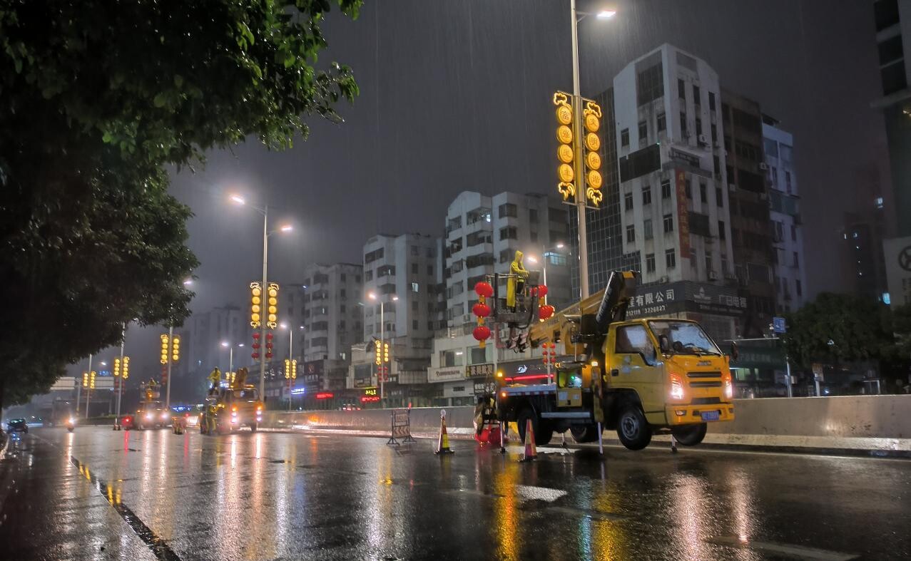 大紅燈籠高高掛,市政工人冒雨裝扮蓬江大街小巷