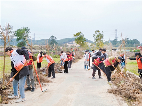 在潮連街道富岡社區(qū),來(lái)自市直部門(mén)、區(qū)直部門(mén)、社團(tuán)組織的黨員干部和村民、志愿者一起熱火朝天地開(kāi)展植樹(shù)活動(dòng),一同種下“桃李林”“國(guó)防林”“檔案林”“雄獅林”“幫扶林”“富岡林”“家庭林”等7片各具特色的主題林,為鄉(xiāng)村道路增添了綠色和生機(jī)?!按舜位顒?dòng)種下約100棵黃花風(fēng)鈴和桂花樹(shù),樹(shù)苗主要由源林投資(廣東)有限公司董事長(zhǎng)關(guān)杰初先生捐贈(zèng)?!瘪v富岡社區(qū)第一書(shū)記齊旸表示。