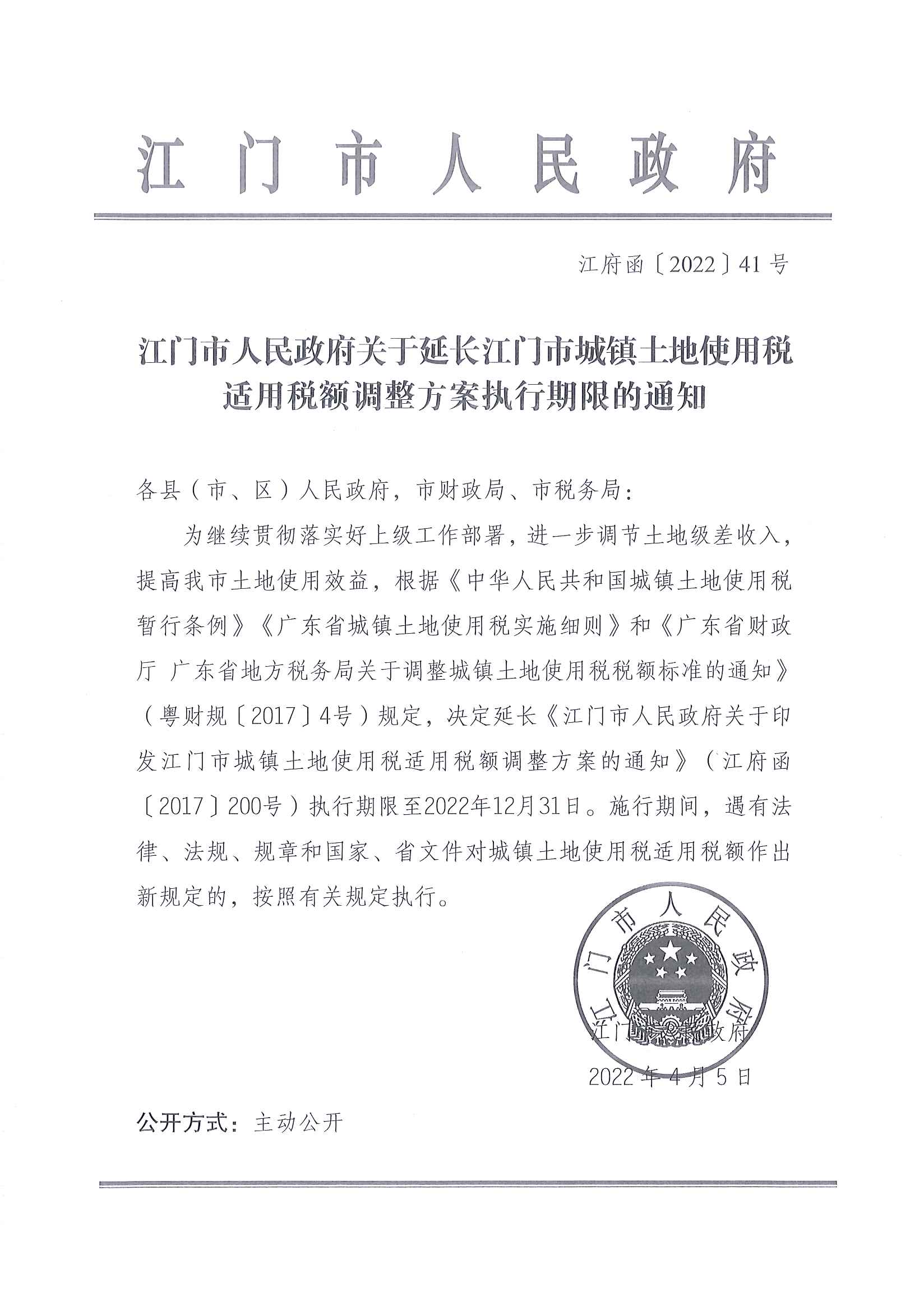 江門(mén)市人民政府關(guān)于延長(zhǎng)江門(mén)市城鎮(zhèn)土地使用稅適用稅額調(diào)整方案執(zhí)行期限的通知