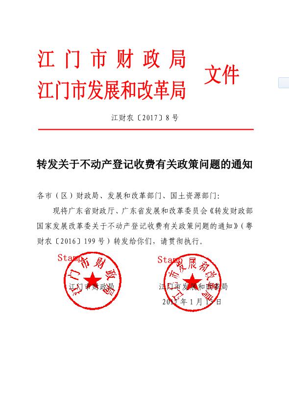 轉(zhuǎn)發(fā)關(guān)于不動產(chǎn)登記收費有關(guān)政策問題的通知 江財農(nóng)[2017]8號