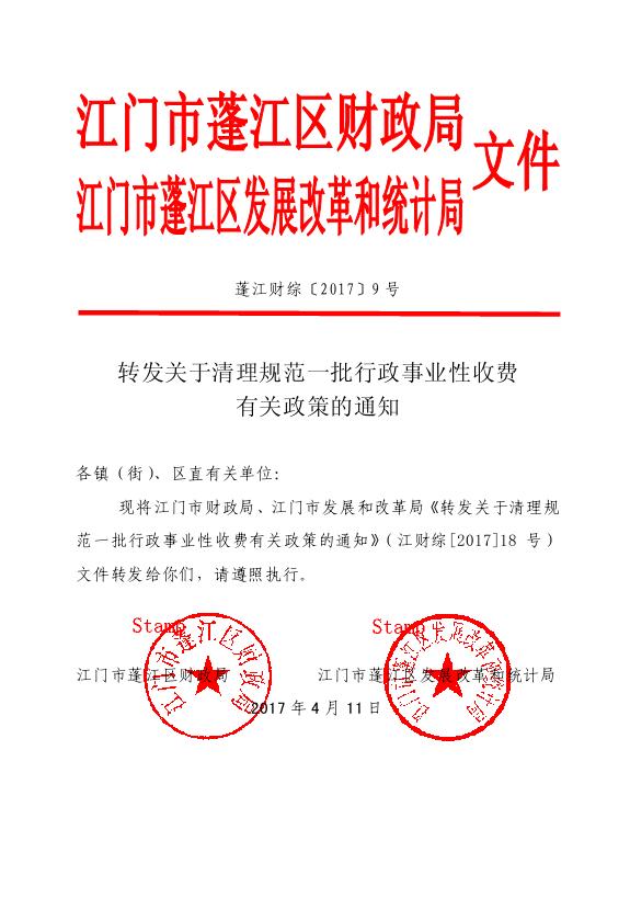 轉(zhuǎn)發(fā)關(guān)于清理規(guī)范一批行政事業(yè)性收費(fèi)有關(guān)政策的通知 蓬江財綜[2017]9號