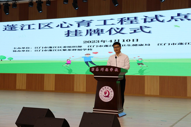 為充分發(fā)揮蓬江區(qū)社會(huì)心理服務(wù)體系作用,進(jìn)一步做好“心理關(guān)愛進(jìn)課堂”工作,4月10日,蓬江區(qū)衛(wèi)生健康局與蓬江區(qū)教育局?jǐn)y手合作,在蓬江區(qū)紫茶群福學(xué)校掛牌成立“蓬江區(qū)心育工程試點(diǎn)學(xué)?!?,以加大學(xué)生心理防治力度,預(yù)防學(xué)生心理危機(jī)事件的發(fā)生。蓬江區(qū)副區(qū)長(zhǎng)利錦波出席活動(dòng)并講話。