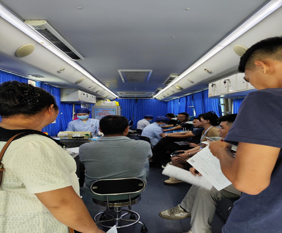 活動啟動后,附近不少居民踴躍加入無償獻血的行列。在流動獻血車前,大家有序排隊,填寫無償獻血登記表、血壓測量、錄入電腦、血液初篩、獻熱血。他們以捐獻熱血的方式,為生命助力、為愛禮贊。