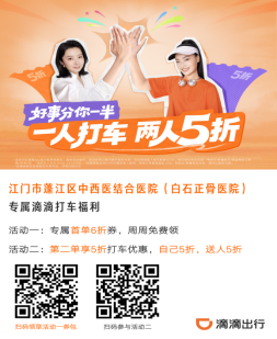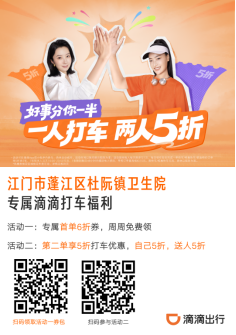 為方便患者就醫(yī),在蓬江區(qū)衛(wèi)生健康局的積極統(tǒng)籌下,轄區(qū)6家醫(yī)療機構聯(lián)合滴滴出行,推出“健康出行”惠民專屬福利,告別烈日暴曬,就醫(yī)路上更輕松!