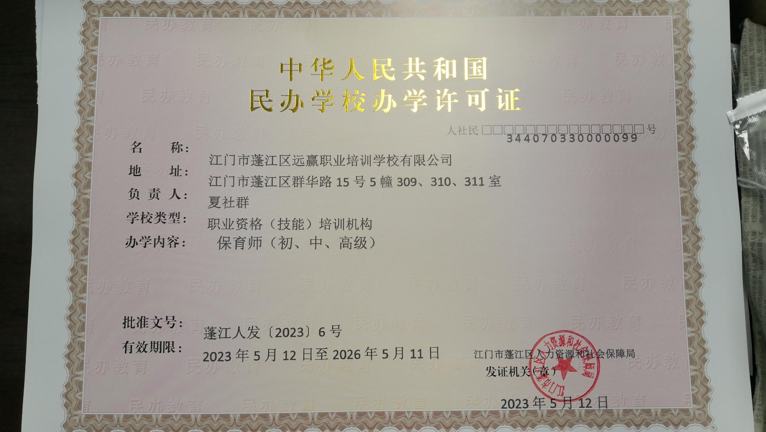 您報送的新設(shè)立江門市蓬江區(qū)遠贏職業(yè)培訓學校有限公司申請材料已收悉,現(xiàn)批復如下:根據(jù)民辦教育的有關(guān)規(guī)定,經(jīng)審核,現(xiàn)同意江門市蓬江區(qū)遠贏職業(yè)培訓學校有限公司設(shè)立申請,并頒發(fā)辦學許可證。