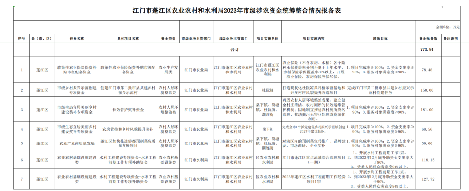 我局2023年市級涉農(nóng)資金統(tǒng)籌整合項(xiàng)目共7個(gè),合計(jì)773.91萬元?,F(xiàn)將相關(guān)項(xiàng)目及資金情況予以公示:
