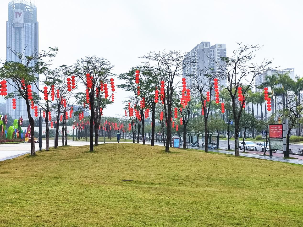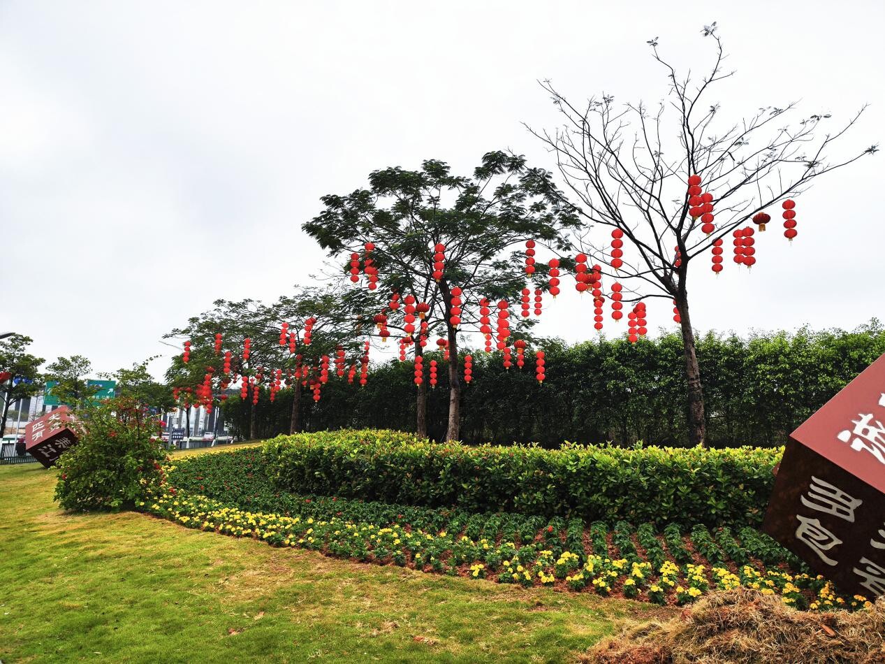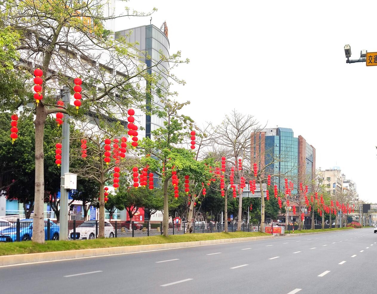 一個(gè)個(gè)紅燈籠悄然地爬上樹梢,為蓬江街頭增添春節(jié)氣息