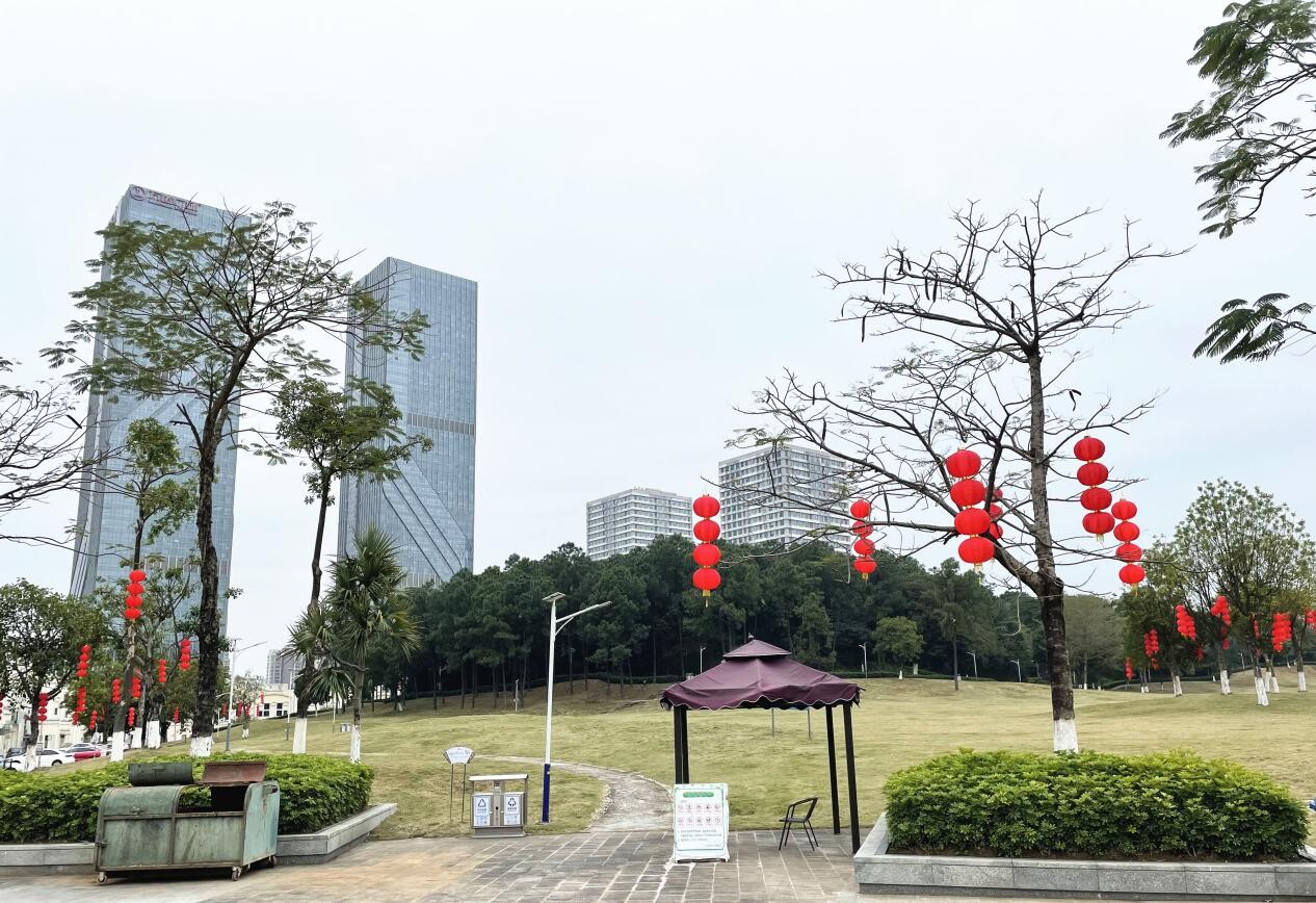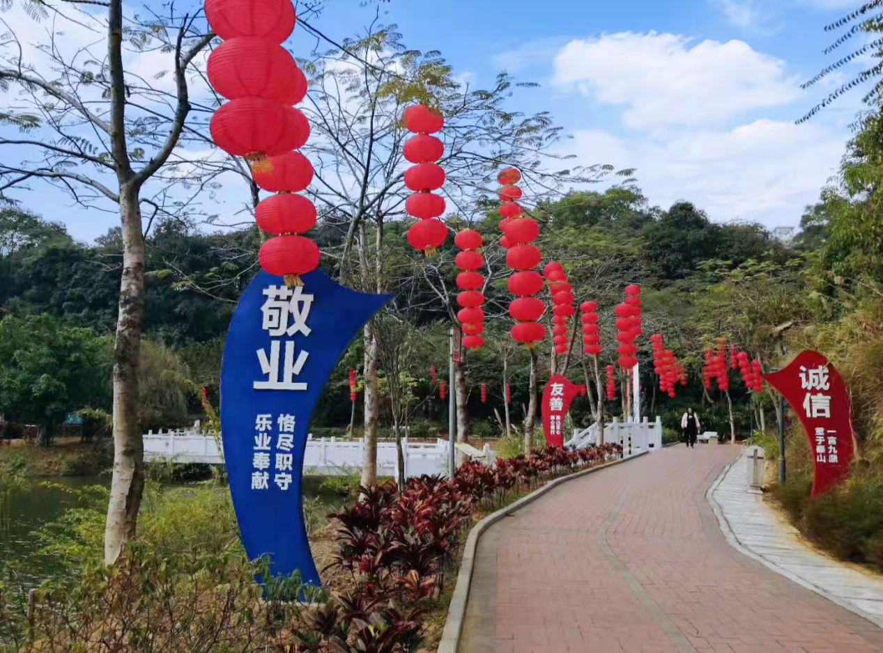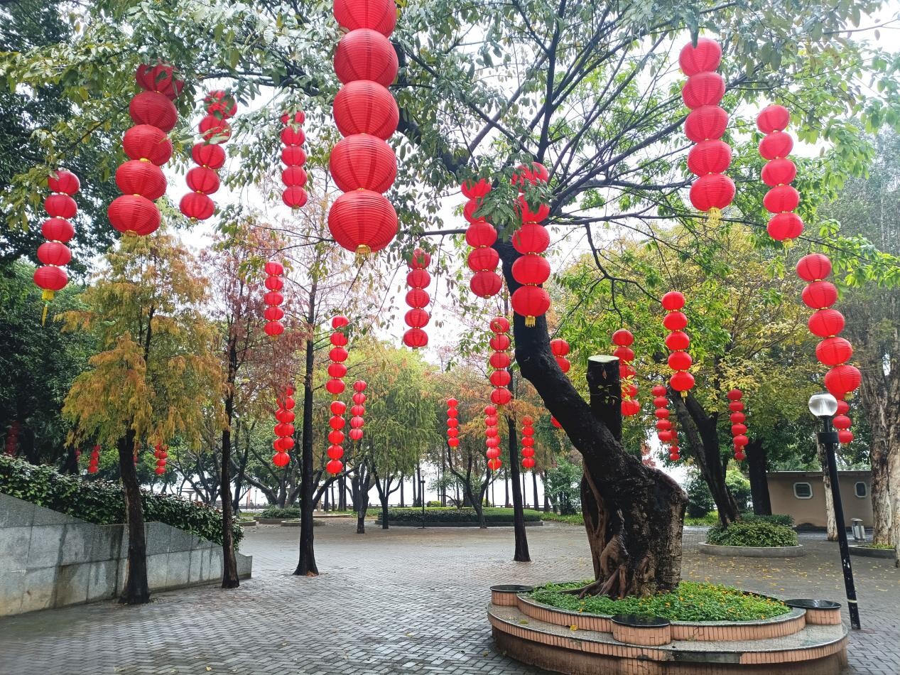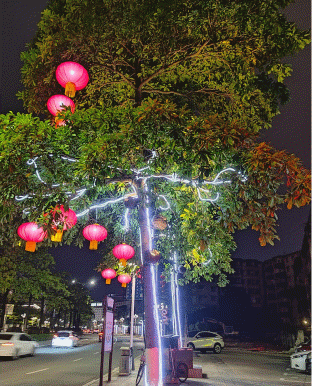 一個(gè)個(gè)紅燈籠悄然地爬上樹梢,為蓬江街頭增添春節(jié)氣息