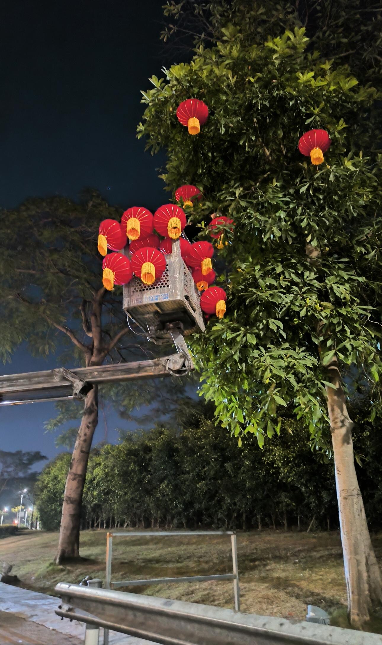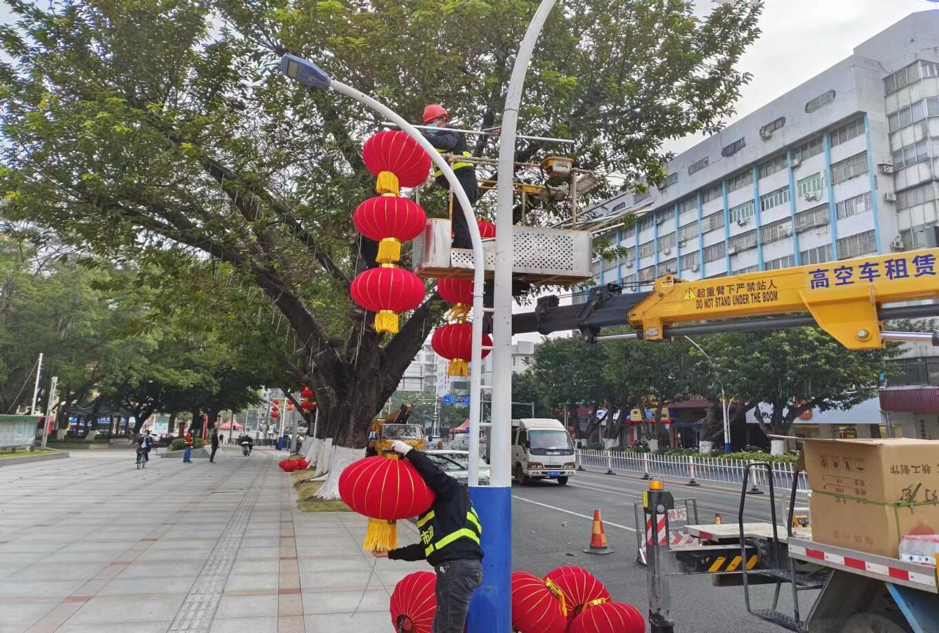 市政工人把紅燈籠懸掛在樹上,一片片象征著春節(jié)的“中國紅”,彌漫在蓬江的大街小巷