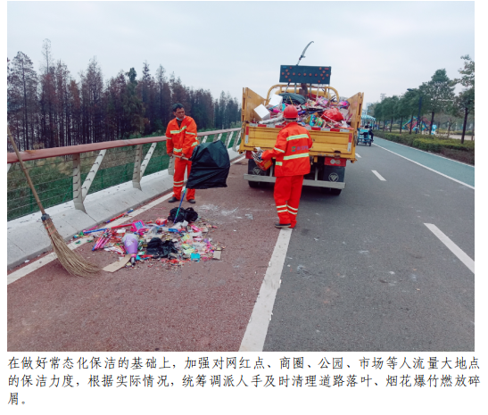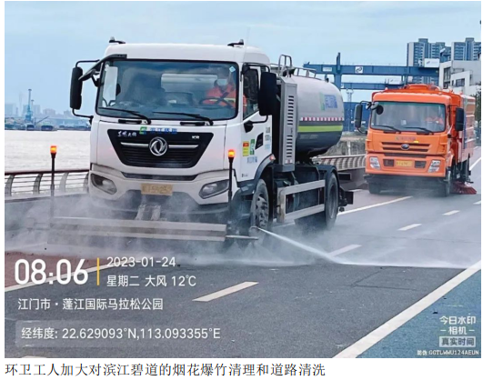 1月21日至27日,蓬江城市管理和綜合執(zhí)法局對(duì)城區(qū)主次干道、濱江大道、三鎮(zhèn)一街、碧道、公園出動(dòng)巡查和管理人員約1000人次,車輛約70臺(tái)次,日均出動(dòng)環(huán)衛(wèi)工人約2500人,日均出動(dòng)養(yǎng)護(hù)車、三輪電動(dòng)保潔車等各式環(huán)衛(wèi)車輛約900臺(tái),日均清理明渠約100條,累計(jì)清運(yùn)生活垃圾約5000噸。