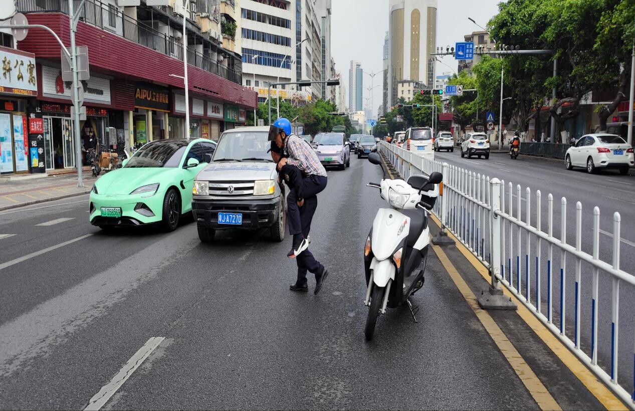 梁健能見狀立即上前扶起倒地的女子和車輛,并配合交警作應(yīng)急處理,得知傷者無需醫(yī)護(hù)救助、自行離開后,方才默默回到工作崗位上繼續(xù)開展執(zhí)勤。