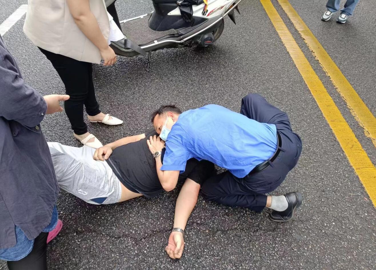 得知家屬已撥打120急救電話,陳毅勇在做好現(xiàn)場錄像和指揮交通并撥打110電話,徐龍友則檢查傷者脈搏、心跳等情況,并采取心肺復(fù)蘇措施、與傷者保持對(duì)話等,試圖喚醒意識(shí)模糊的傷者,并安撫一旁的家屬情緒。