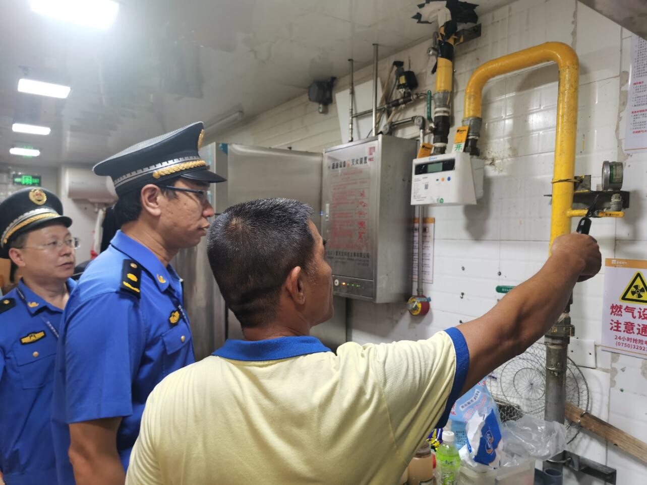 “老板,你們餐廳的報(bào)警器安裝不規(guī)范,要馬上聯(lián)系供氣單位進(jìn)行整改。還有廚房的燃?xì)廛浌芤渤L(zhǎng)和老化,很容易發(fā)生泄漏的。作為餐飲的主要負(fù)責(zé)人,安全要放在第一位?!迸罱瓍^(qū)城市管理和綜合執(zhí)法局工作人員在檢查餐飲行業(yè)時(shí)對(duì)負(fù)責(zé)人說(shuō)。