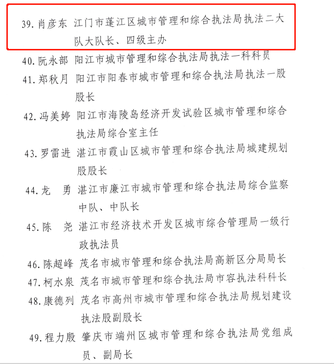 近日,廣東省住房和城鄉(xiāng)建設(shè)廳對全省城管執(zhí)法系統(tǒng)2023年度全面提升執(zhí)法能力和服務(wù)水平專項行動工作成效突出單位及工作突出的先進(jìn)典型予以表彰。江門市共1個集體、3名個人上榜。其中,蓬江區(qū)城市管理和綜合執(zhí)法局執(zhí)法二大隊肖彥東同志榮獲全省城管系統(tǒng)2023年度全面提升執(zhí)法能力和服務(wù)水平工作成效突出個人。