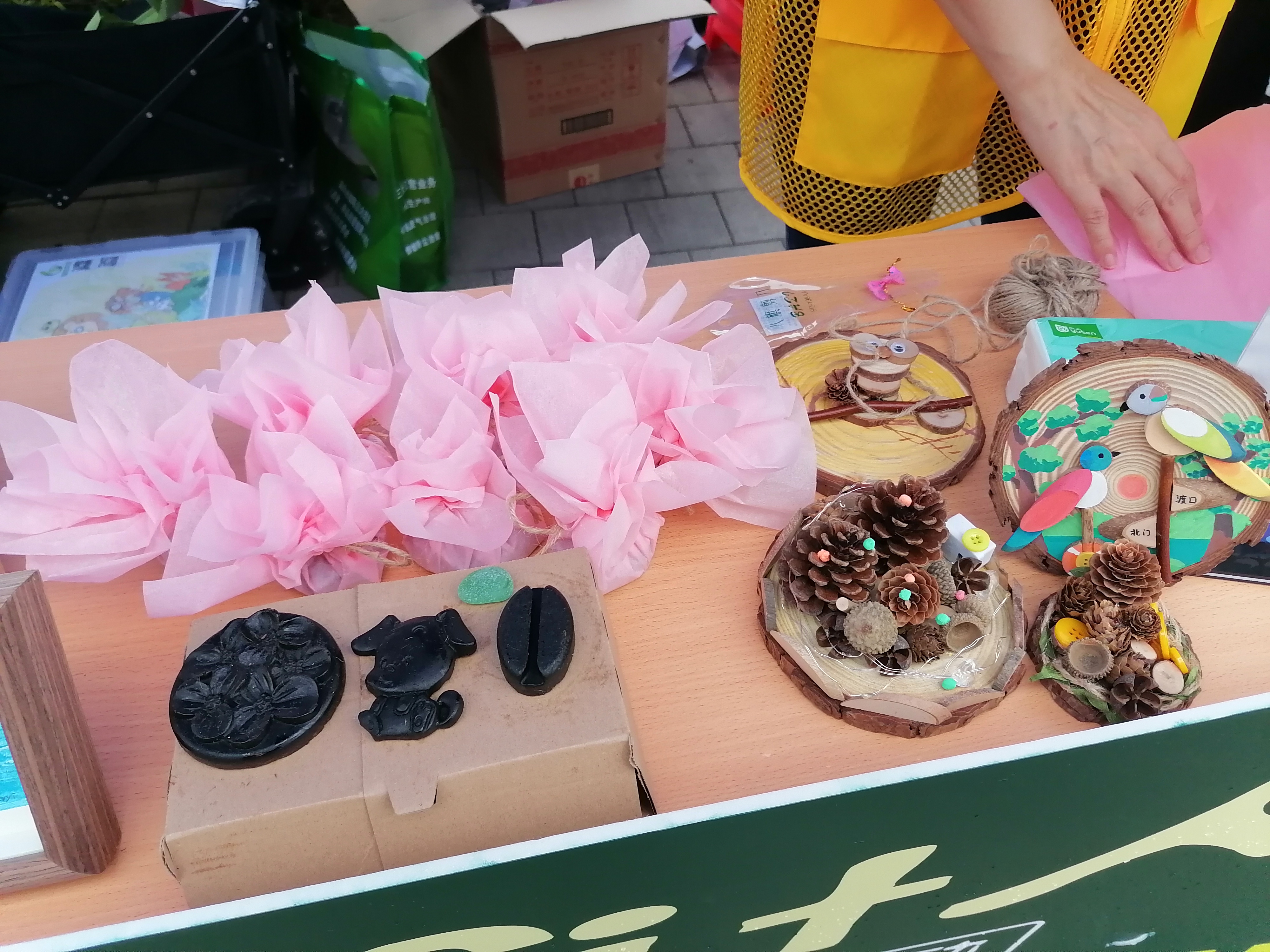 △現(xiàn)場(chǎng)展示使用廢棄咖啡渣制成的手工皂、利用廢棄木料制作的冰箱貼等“變廢為寶”作品